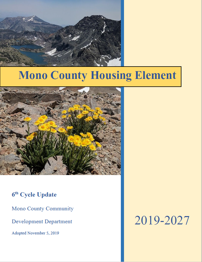The 2019-2027 Mono County Housing Element was adopted at the November 5, 2019, Board of Supervisors meeting. The Housing Element is a mandated section of the General Plan and provides an analysis of the county’s housing needs for all income levels and strategies to meet those needs. The document contains three sections: 1) Goals and Policies, which identifies programs that promote the production of housing; 2) Technical Appendix, which provides background information, including demographics and a detailed site inventory; and 3) Progress Report providing updates on programs from the prior Housing Element. A copy of the approved Mono County Housing Element is attached below.