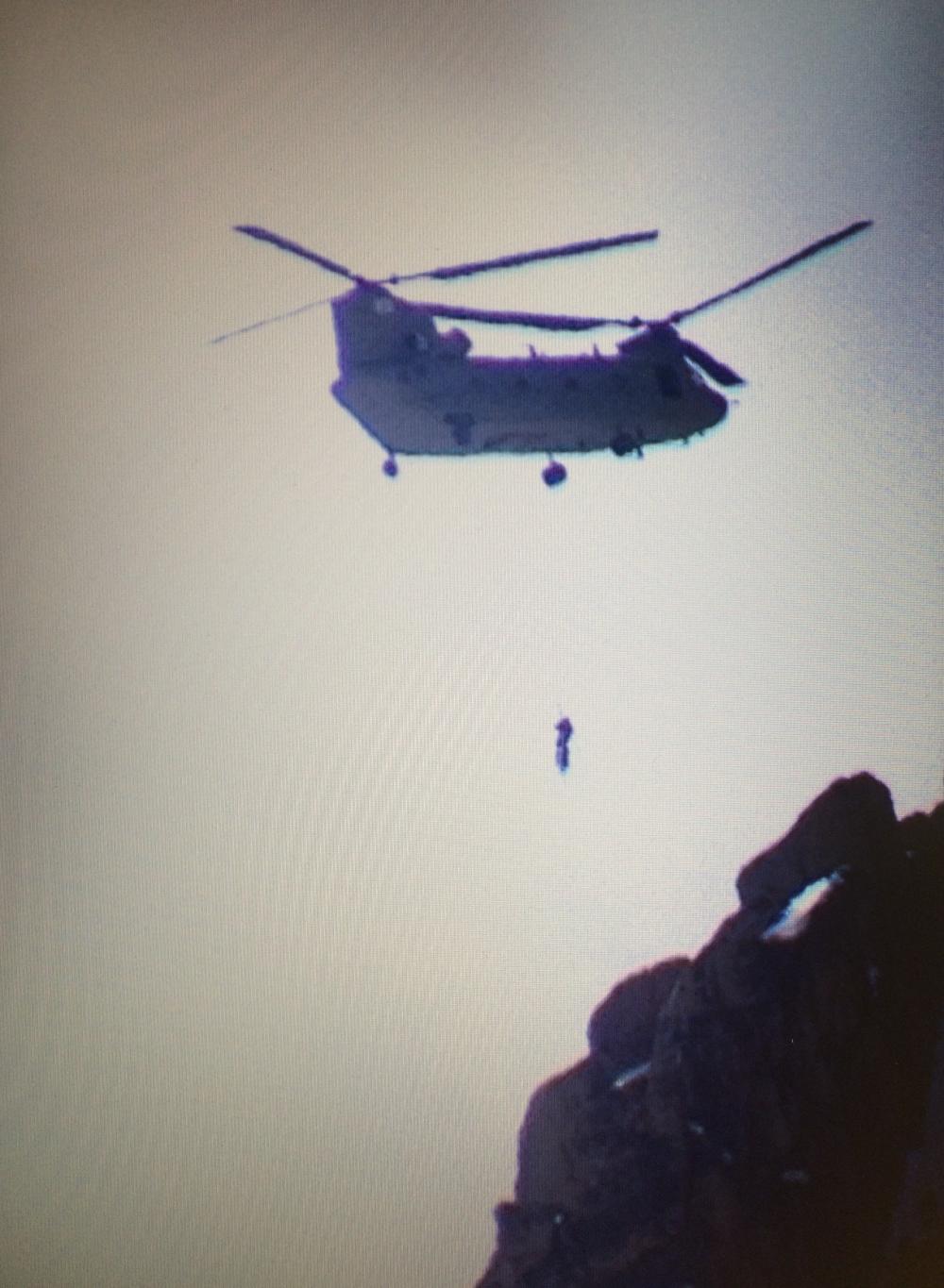 The CH-47-F helicopter was one of ten delivered to the National Guard in December. This rescue was the first one for this model. New equipment on this model was a critical component in the helicopter being able to rescue the hiker in high altitude, windy conditions and a steep slope location. The helicopter pilot was able to use new ‘hover hold’ features to maintain a precise position near the cliff face during the extraction operation.