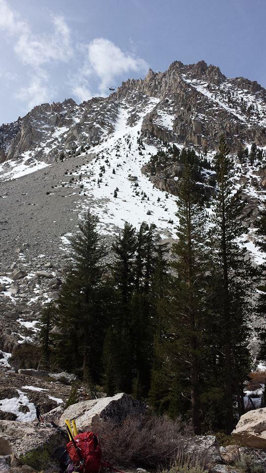 The Mono County Sheriff’s Search and Rescue (SAR) Team, and a California Highway Patrol (CHP) helicopter out of Auburn, CA, was dispatched to aid in the location search and rescue of the injured hiker. Due to high winds, the CHP helicopter had limited capability of searching the peaks and valleys above 12,000 feet, so a larger helicopter was requested. Just prior to dark, a rescue helicopter from Fallon Naval Air Station reached the search area and located the hiker at approximately the 10,000 foot level on a steep slope just below the crest of a ridgeline known as “The Cleaver,” two miles north of Matterhorn Peak. The Navy helicopter tried numerous times to lower a medic to the hiker but was unsuccessful due to high winds, the steep slope angle and darkness.